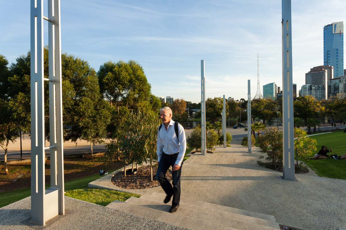 The new stairway adds a critical axis connecting the high ground of the park and the city at Exhibition Street to the riverside terrace below. The stairway was conceived as a hillside escarpment where the staggered staircase is punctuated with regular, broad-edged, terrace-like outcrops, planted with grouped trees. With this form, the stairs allow casual occupation of the hillside.