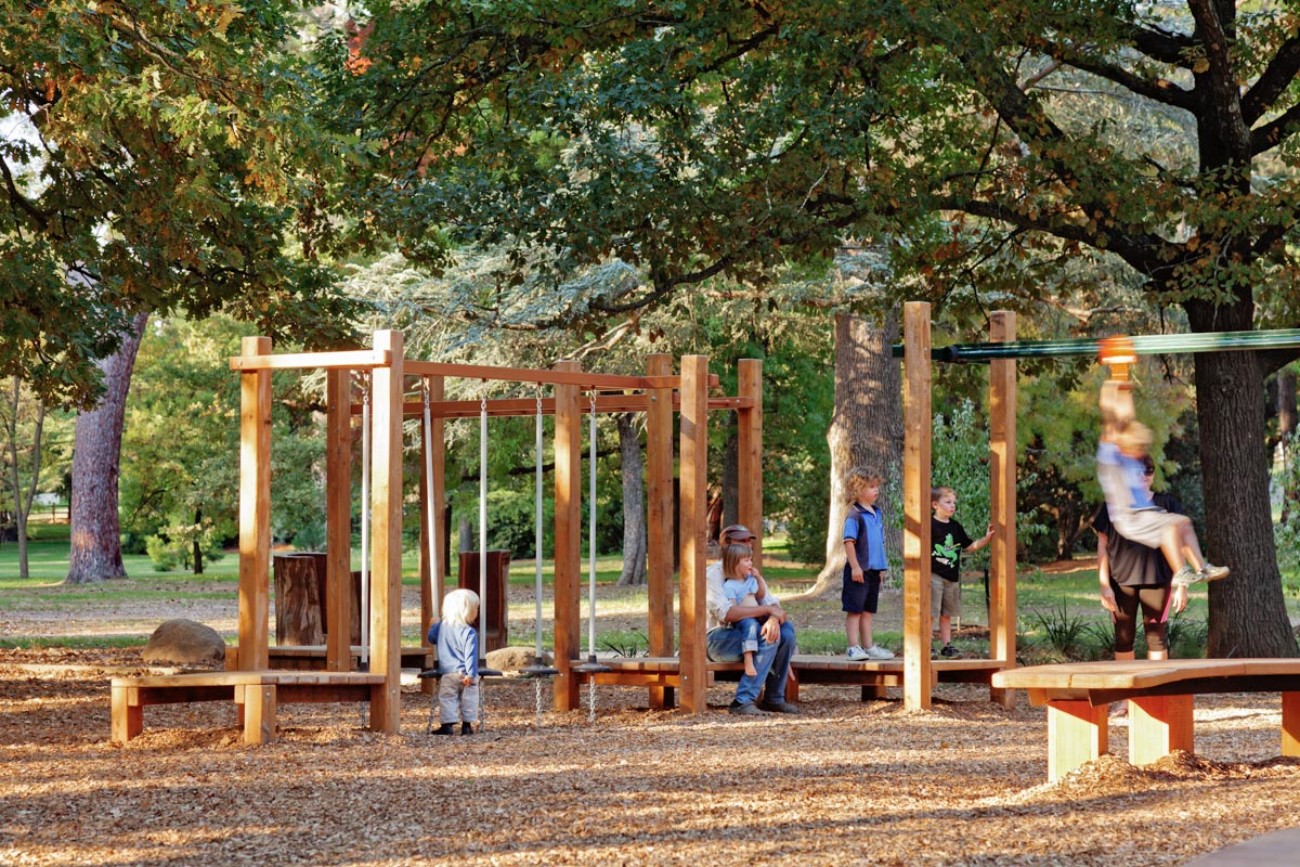 The project centres around a previously-commissioned picnic shelter intended to reference the original design and orientation of a former structure in the Gardens. Notable custom elements include a ‘treehouse’ area, equipment for physical play, such as a hammock and a junior kids’ structure that features bespoke oak leaf panels. The gold-mining theme inspired a miner’s cottage and log train that travels towards an arching bridge structure.