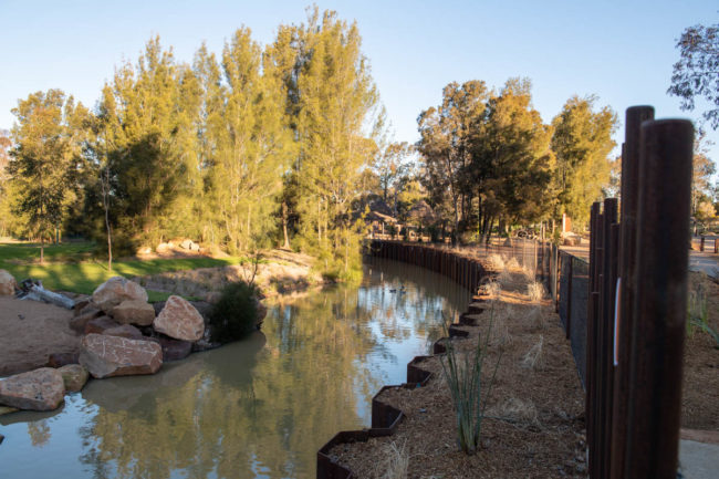 A naturalistic ‘riffle’ stream connects the two sides of the moat prior to recirculation back up to a new wetland, aerating water and reducing nutrient loads, and simultaneously creating a more naturalistic, immersive exhibit experience. Earth mounding was added for topographical interest, allowing the animals to gain ‘prospect’ and display their natural behaviours as well as creating locations for naturalistic ‘den’ shelters.