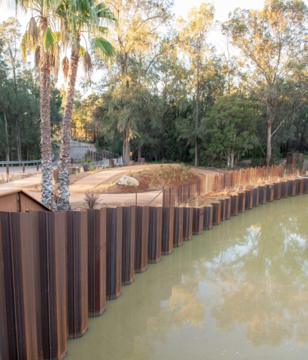 Urban Initiatives’ design response balanced functional, ecological, aesthetic and animal welfare considerations. A new Corten steel sheet piling system was used for its robust nature, construction efficiency and to provide an attractive common material language for the new animal containment moat wall, the main visitor viewing and keeper feeding deck, and the new visitor stand-off fencing. Urban Initiatives conceived a dramatic Corten steel ‘curtain’ through which visitors move into an intimate, close-up encounter with a large group of some of the African Savannah’s most enigmatic and brutal carnivores, the African Wild Dog.