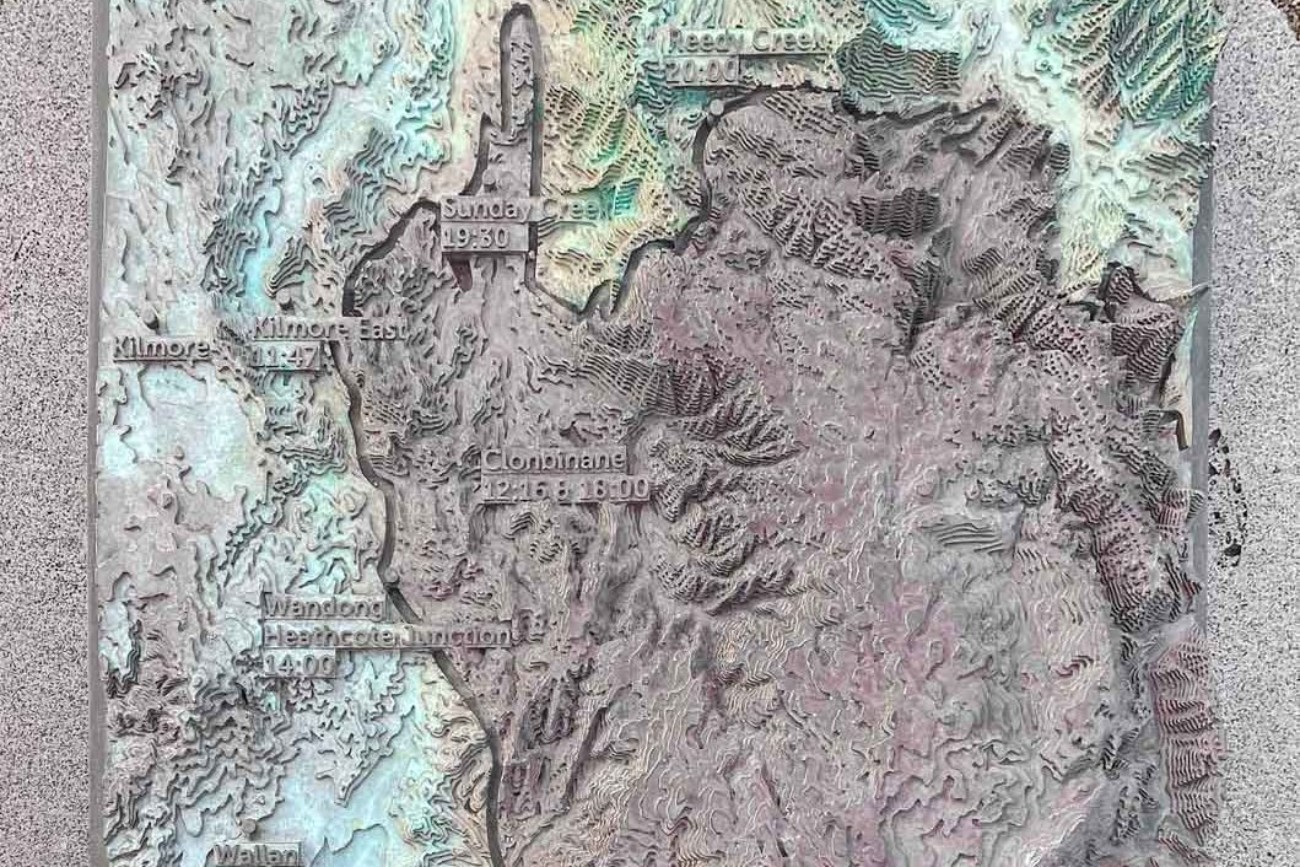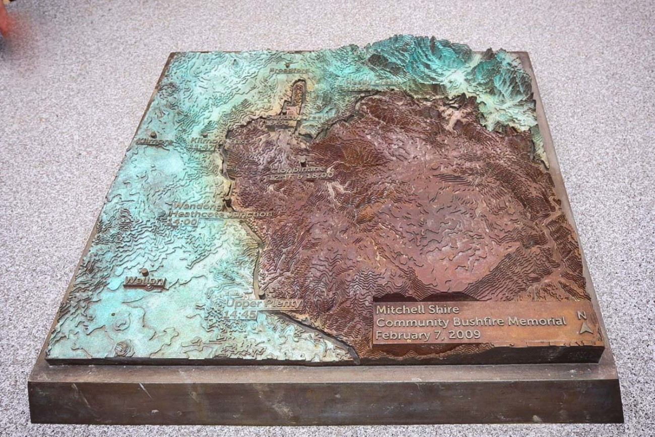 The smaller memorials, located in Kilmore East, Wandong, Upper Plenty, Sunday Creek and Reedy Creek, connect each of these townships. Commonalities are conveyed through repeated design components, a timeline communicated on a cast bronze memorial plaque displaying the time that the fire reached each town, and a topographic map of the region.