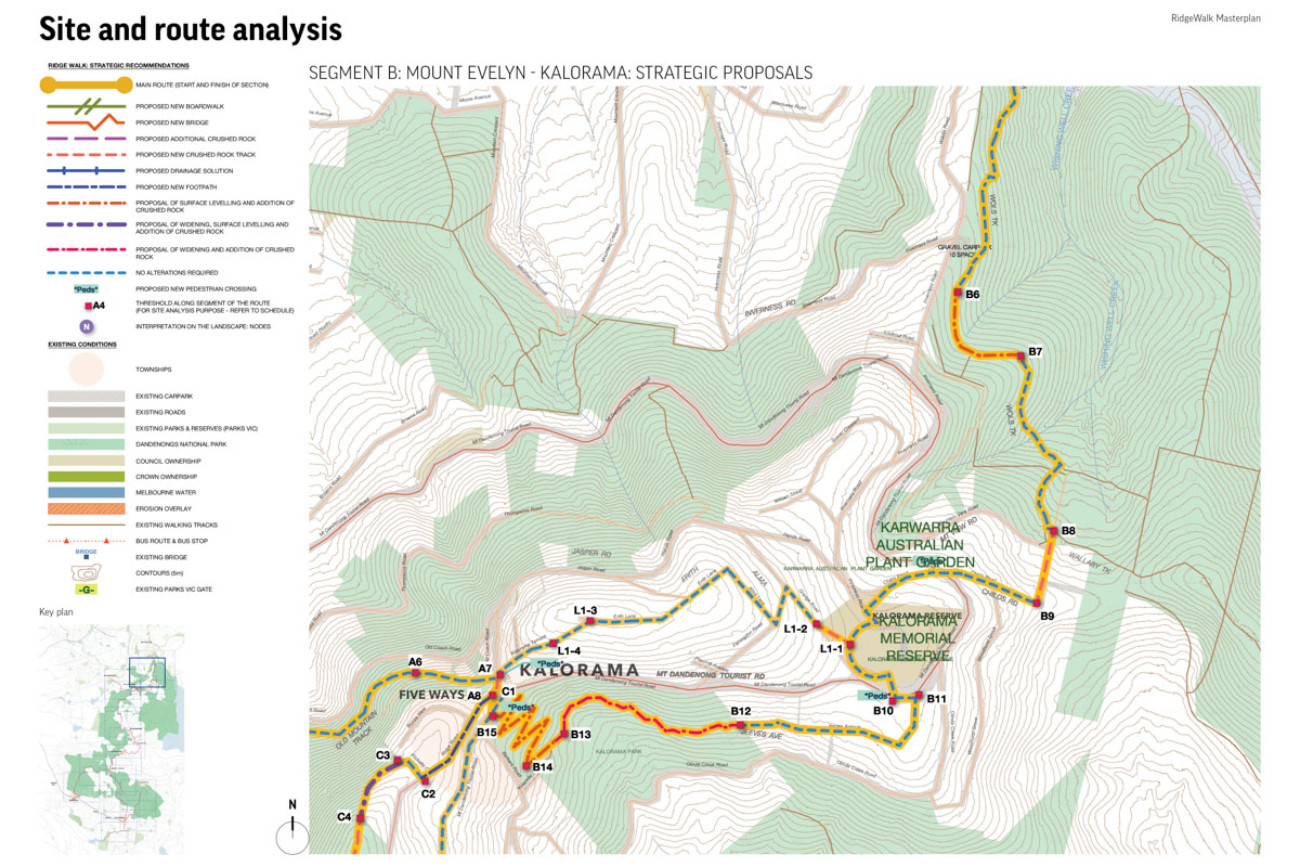Urban Initiatives, in association with Arterial Design, was engaged by the Shire of Yarra Ranges to prepare a Masterplan for RidgeWalk, a 40km walking track showcasing history and culture within the Dandenong Ranges. It celebrates the contribution of local artists compelled to capture the particular beauty of the landscape, with the trail’s location designed to guide visitors through the context of these artists’ work, both within the landscape and wider historical movements. Opportunities for new artistic interventions which respond to the landscape are created also.