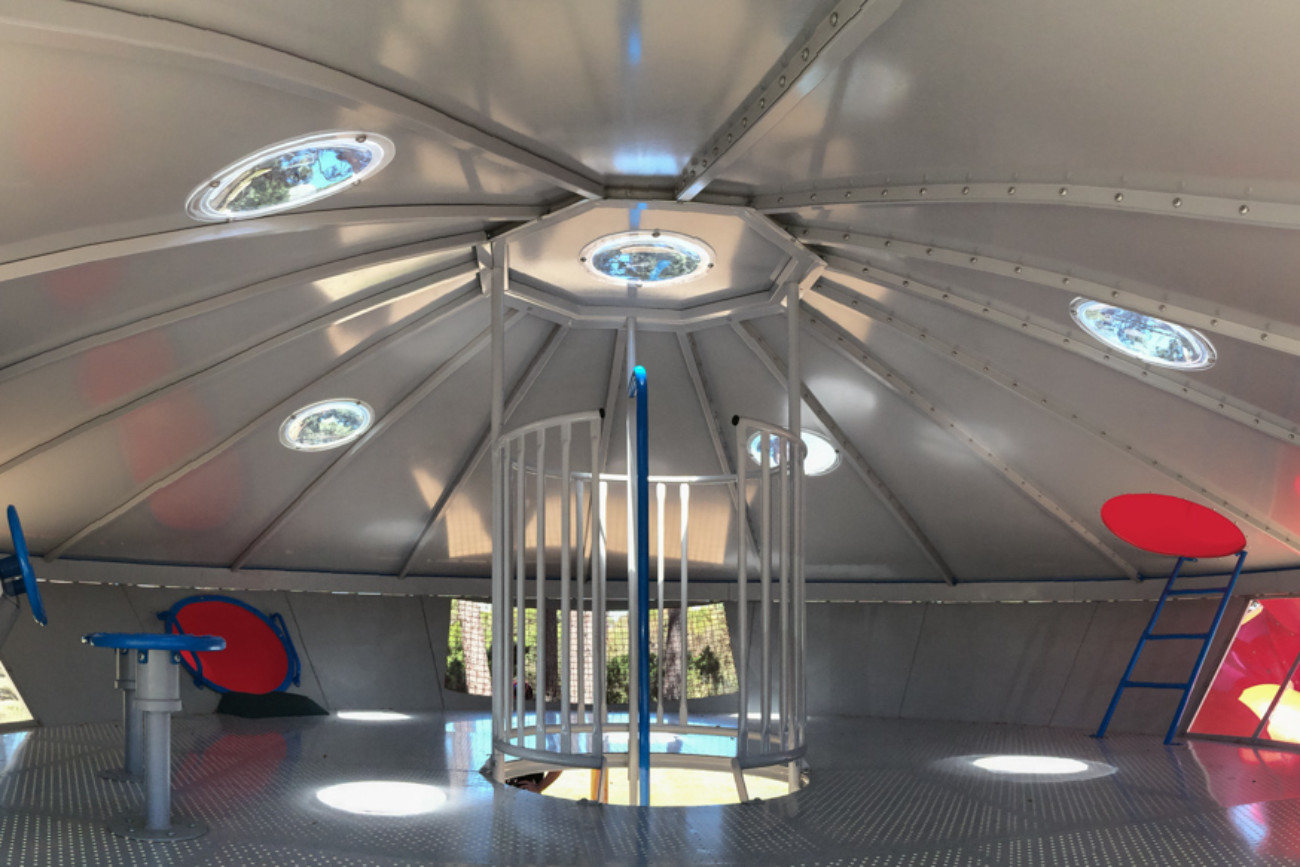 Designed in close collaboration with the Kingston City Council and Allplay, the playspace features a unique giant flying saucer, with control panel, slides and climbers. Blue LED lights around the perimeter make the saucer a local landmark at night, as they shine through the pine arboretum.