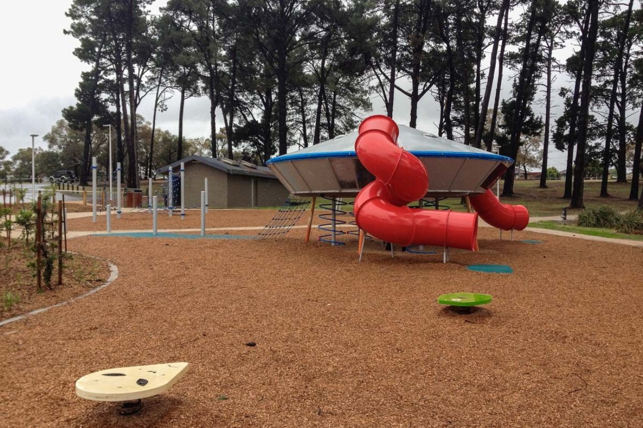 On 6 April 1966, around 200 students and teachers at Westall High School saw two flying objects over their school in broad daylight. These objects have never been identified, although there is great consensus about their disc-like shape and silver colour. Observers do not say that they were alien, but that they were unlike anything they have seen before. One of the objects landed at what is now The Grange Reserve, and this playspace takes inspiration from their experiences.