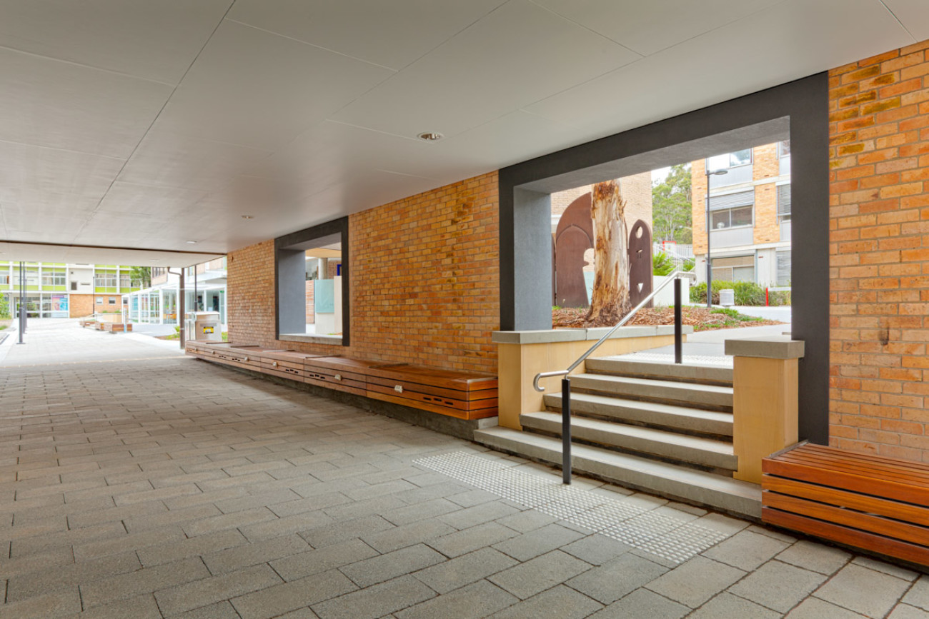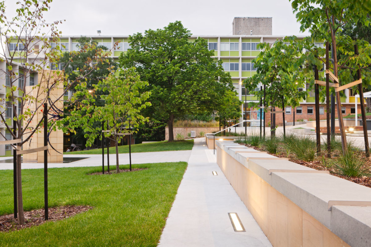The distinction of the project lay in amplifying the unique attributes of the Sandy Bay Campus site, its heritage and setting using locally quarried sandstone in a refined and contemporary way, locally manufactured textured concrete pavers, richly coloured durable hardwood and an elegant planting palette, highlighting Tasmanian perennial species.